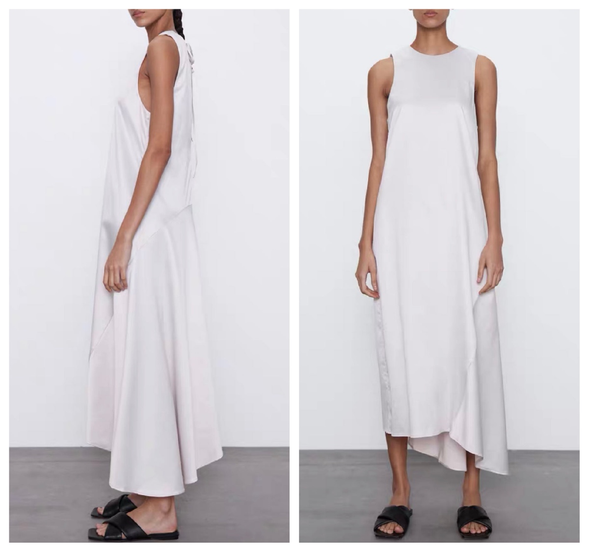 如果手臂线条和肩部曲线足够优秀,那么可以在中长款+收腰的基础上,选择吊带或者一字肩的设计,放大上半身清凉感,视觉上也更显瘦了。